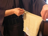 下の端も上辺同様に巾の中心に向かって帯揚げの両脇からくるくると2.5cm程度の幅になるまで帯揚げの生地端を隠すように巻いていきます。